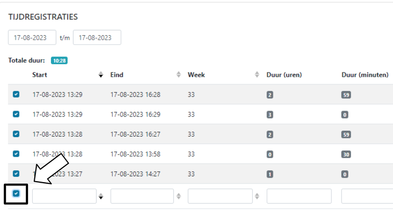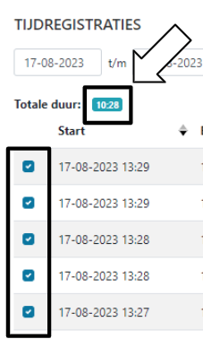 De berekening van de totale duur is standaard de optelling van de getoonde tijdregistraties. Indien één of meerdere registraties worden aangevinkt zal een totaal van deze selectie worden berekend en worden getoond bij ‘Totale duur’.