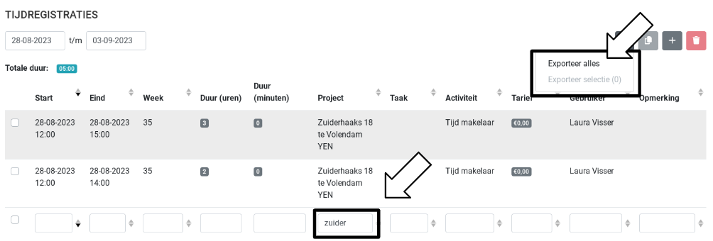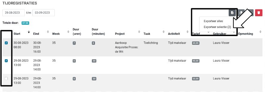 Als je binnen het overzicht van tijdregistraties een filter invult zal de export alleen de gefilterde regels meenemen. Indien je één of meerdere registraties aanvinkt kun je ervoor kiezen alleen deze selectie te exporteren via de export functie.