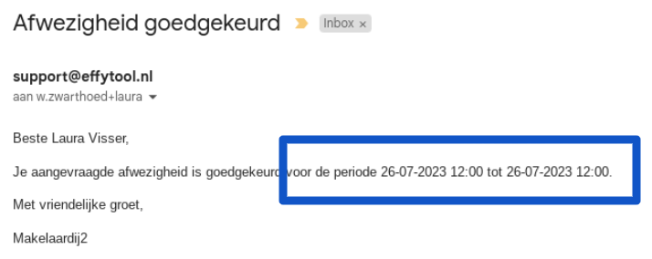Via Effytool kan verlof worden vastgelegd en berekend. Indien een verlof wordt goedgekeurd worden de data van het verlof meegenomen in de bevestigingsmail.