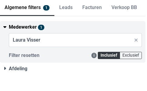 Binnen de Analytics tool kunnen filters worden toegepast. Indien er wordt gefilterd op een medewerker of afdeling zullen waar mogelijk de getoonde waardes in de zichtbare rapportages worden aangepast voor deze medewerker of afdeling.